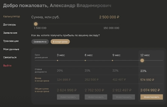 Система сама рассчитывает и показывает процентную ставку, которая будет наиболее выгодной для выбранного периода (3, 6, 9 месяцев или год) — так проще следить за доходностью. Финансовый калькулятор «Личного кабинета» подберет оптимальные условия для инвестора с учетом актуальной ключевой ставки Центробанка РФ.